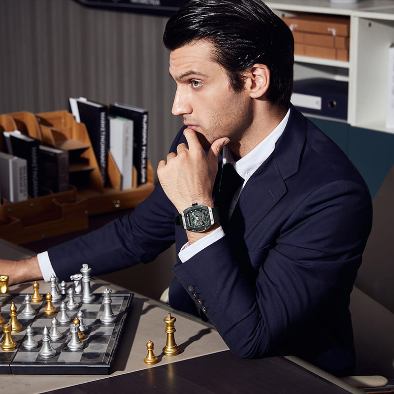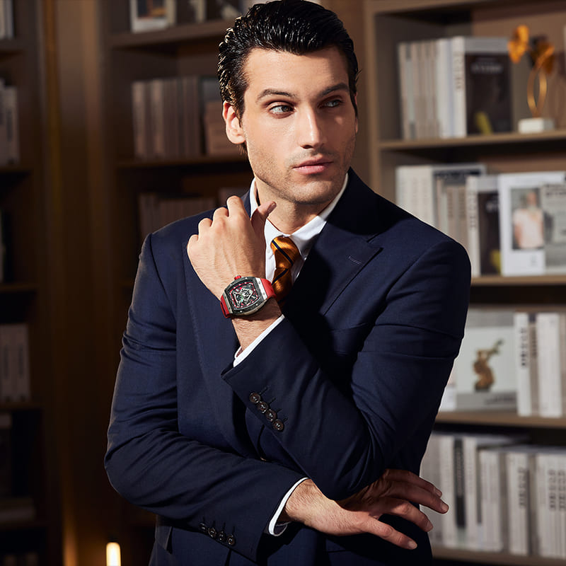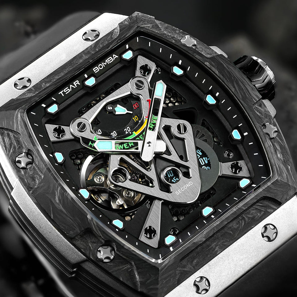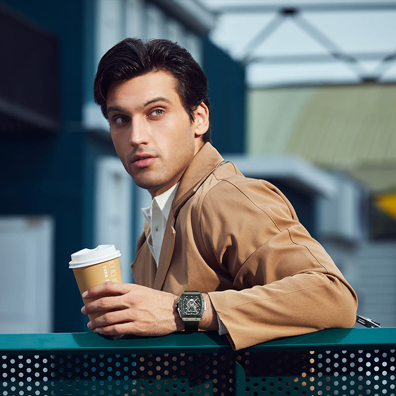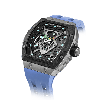 Elegance and strength coexist in this watch, featuring an aviation-grade titanium case and a racing-grade carbon fiber bezel, creating a paradoxical beauty of "feather-weight steel." Titanium's lightness and corrosion resistance, combined with the strength and lightness of carbon fiber, allow you to visually and tactilely experience the power of modern, avant-garde design.