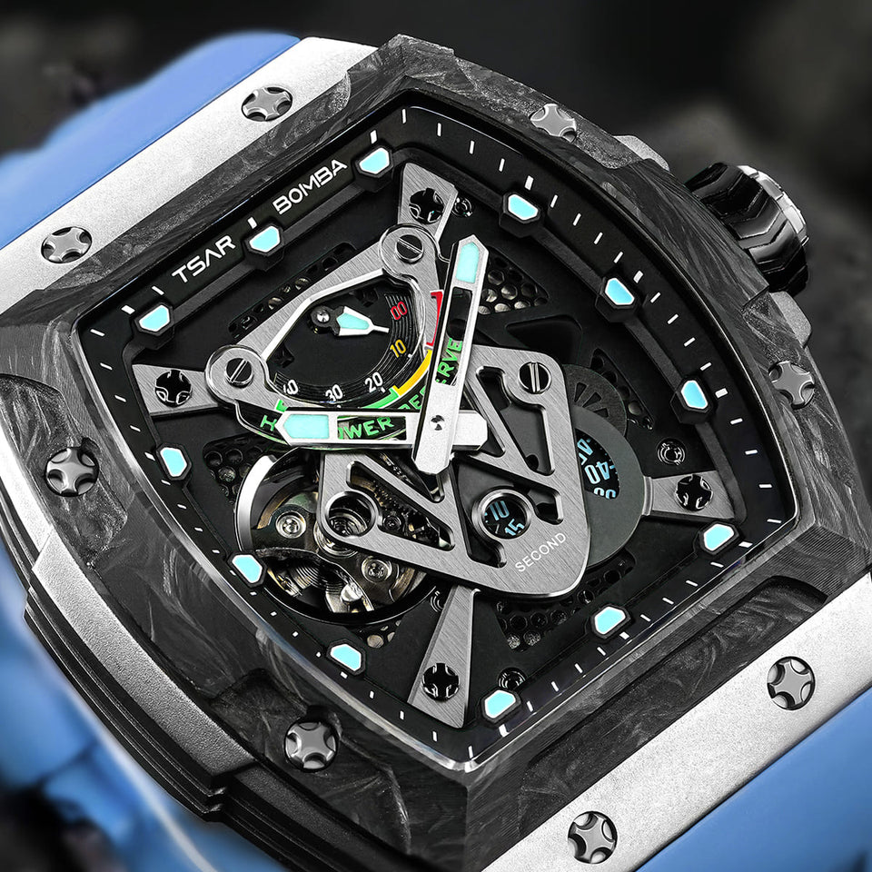 The center of the dial showcases a striking "power reserve" indicator, where the movement of the second hand and balance wheel reveals the life of the mechanism. The transparent structure allows for a panoramic view of the movement's layers, blending the remaining kinetic energy with the rhythmic movement, reminding you that this is more than just a watch; it's a living piece of mechanical art.