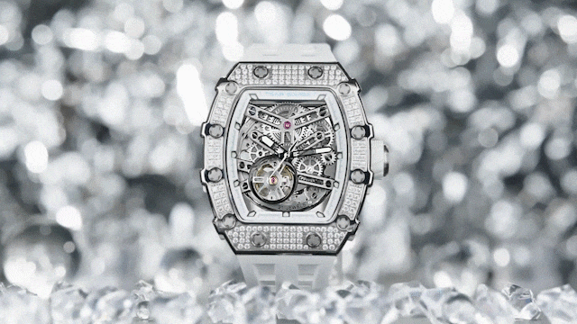 The cubic zirconia-set bezel sparkles with refined elegance, creating a luminous frame around the mechanical core.