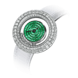 The circular dial features a spiral pattern of faceted stones, leading the eye toward the elegant center hands. Floating crystals add a touch of motion and luxury with every glance.