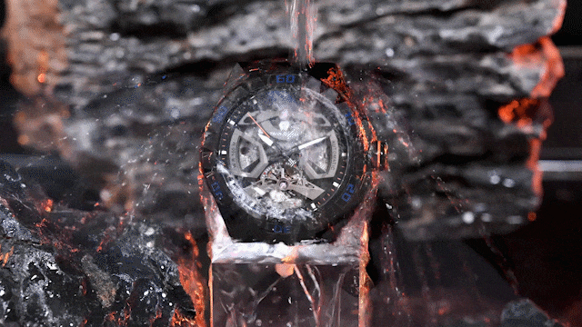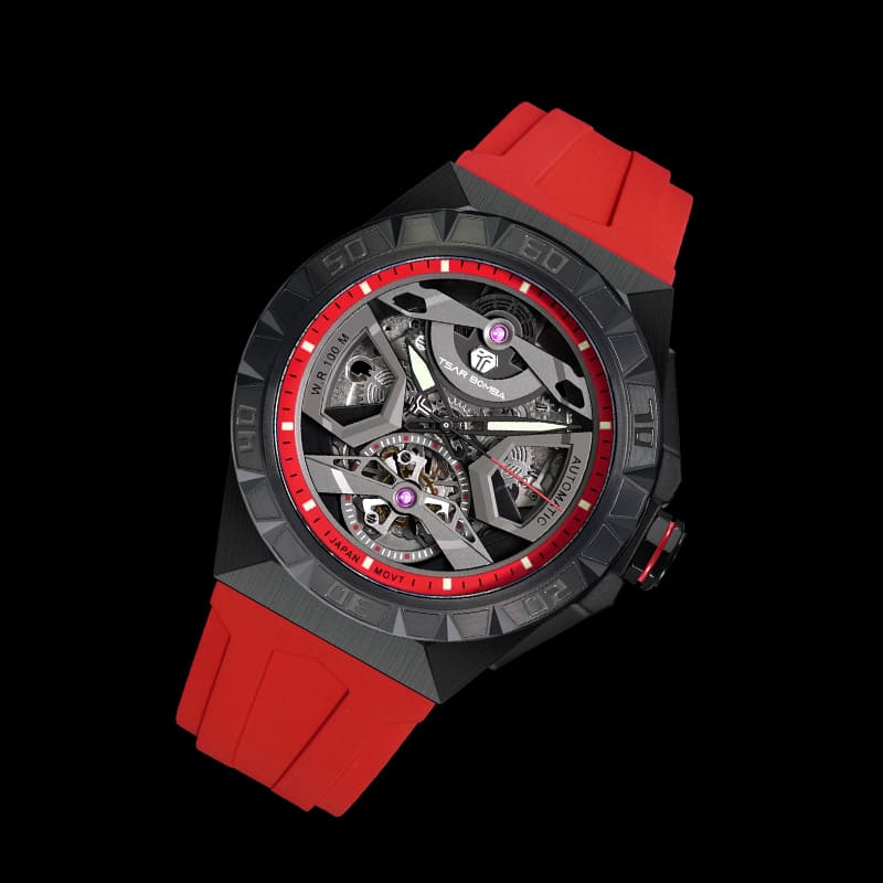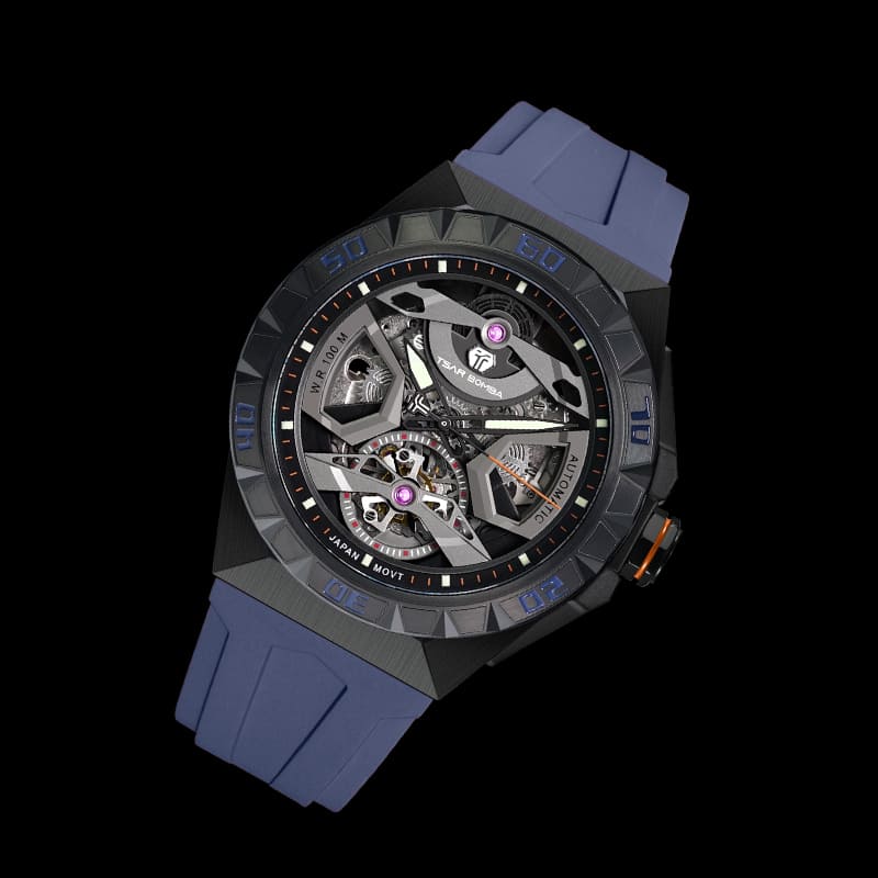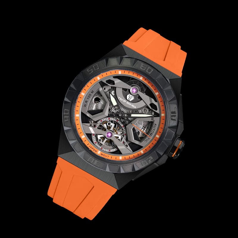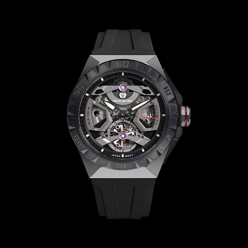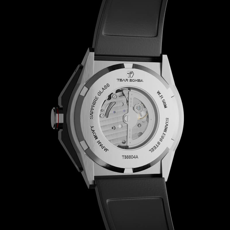 The open mechanical dial reveals the intricate movement within, showcasing the artistry of automatic watchmaking with every turn of the gear.