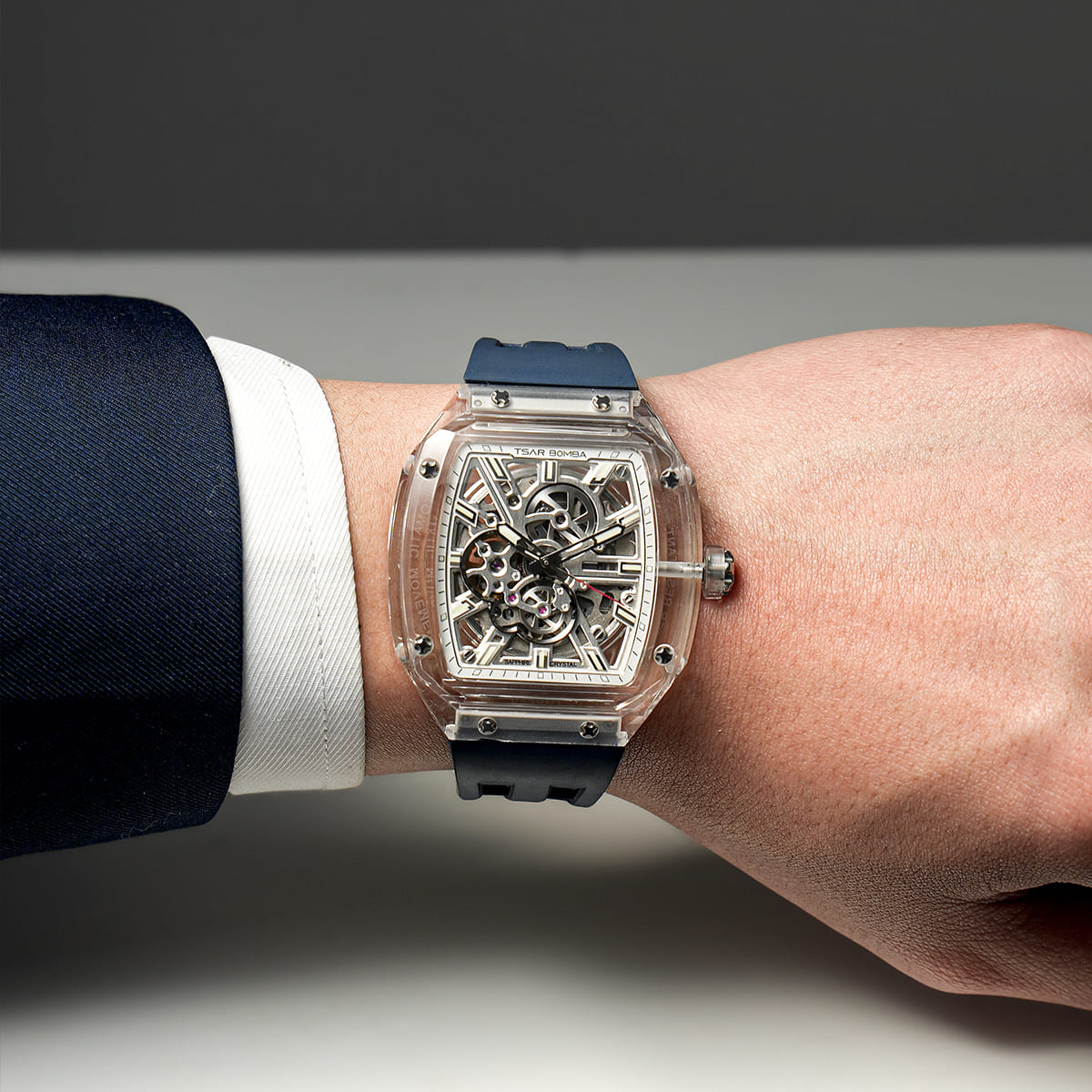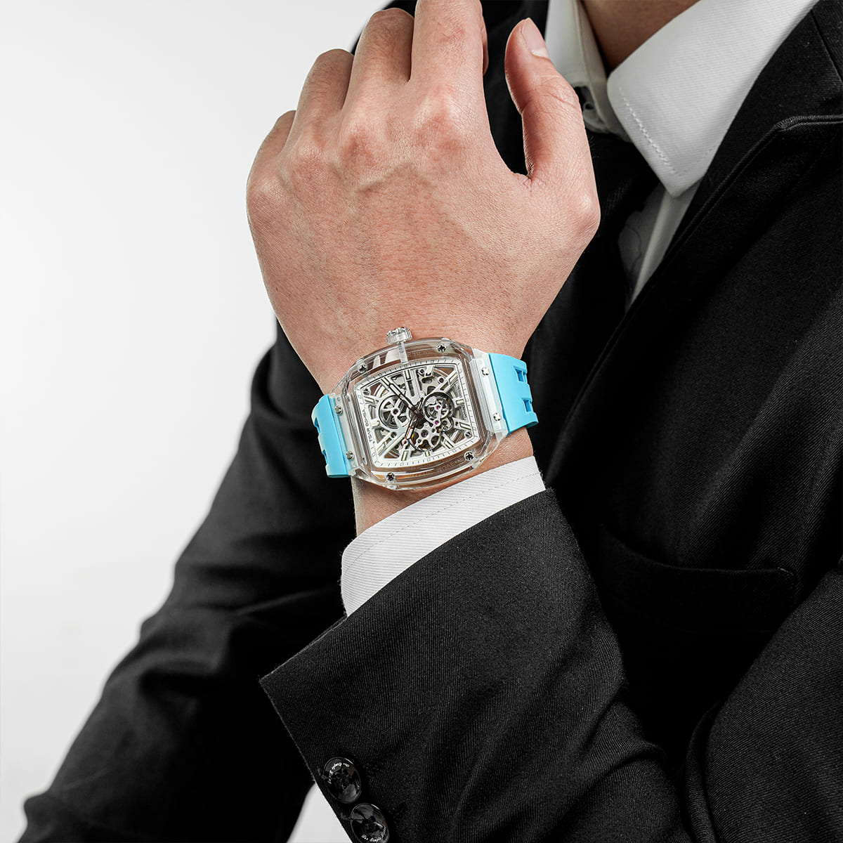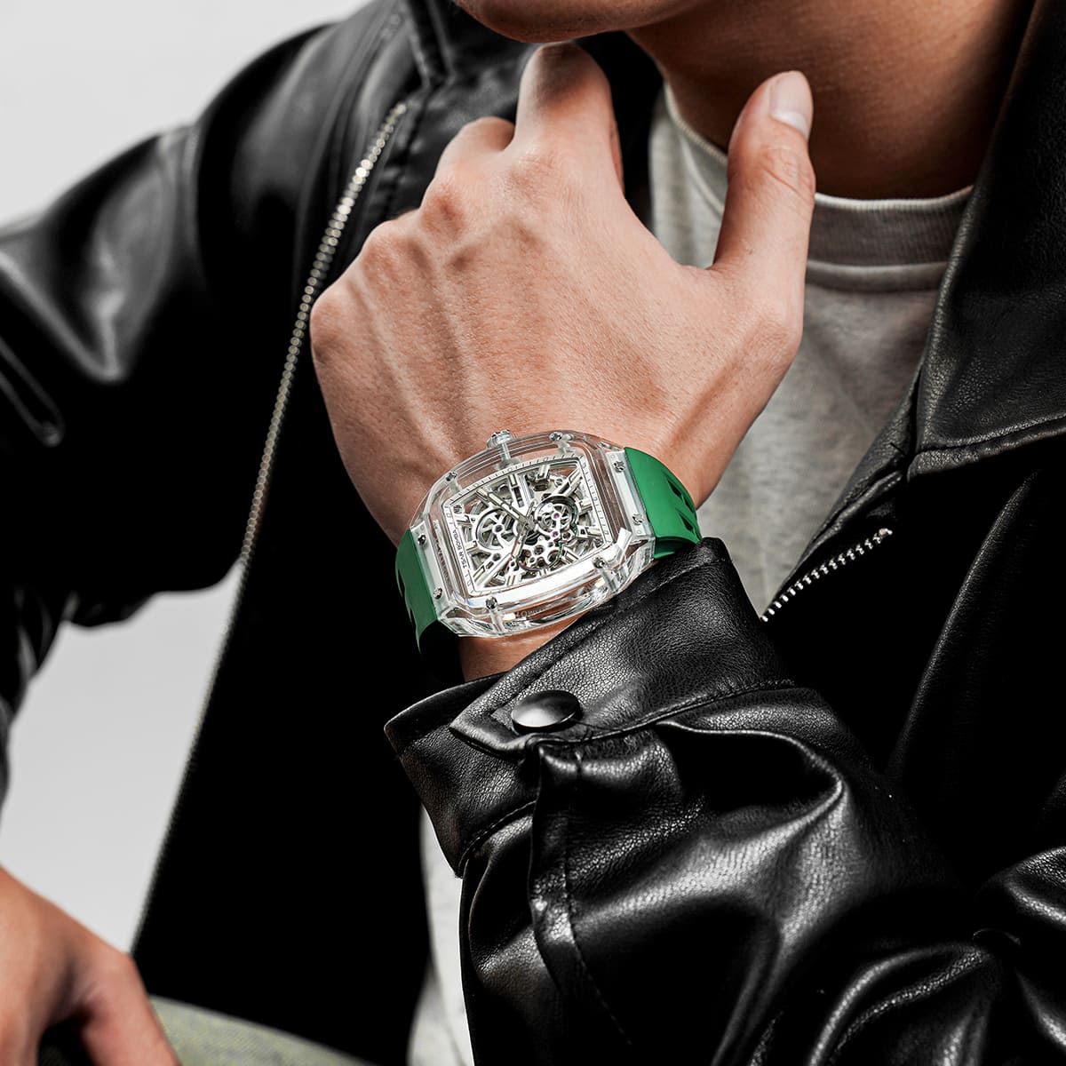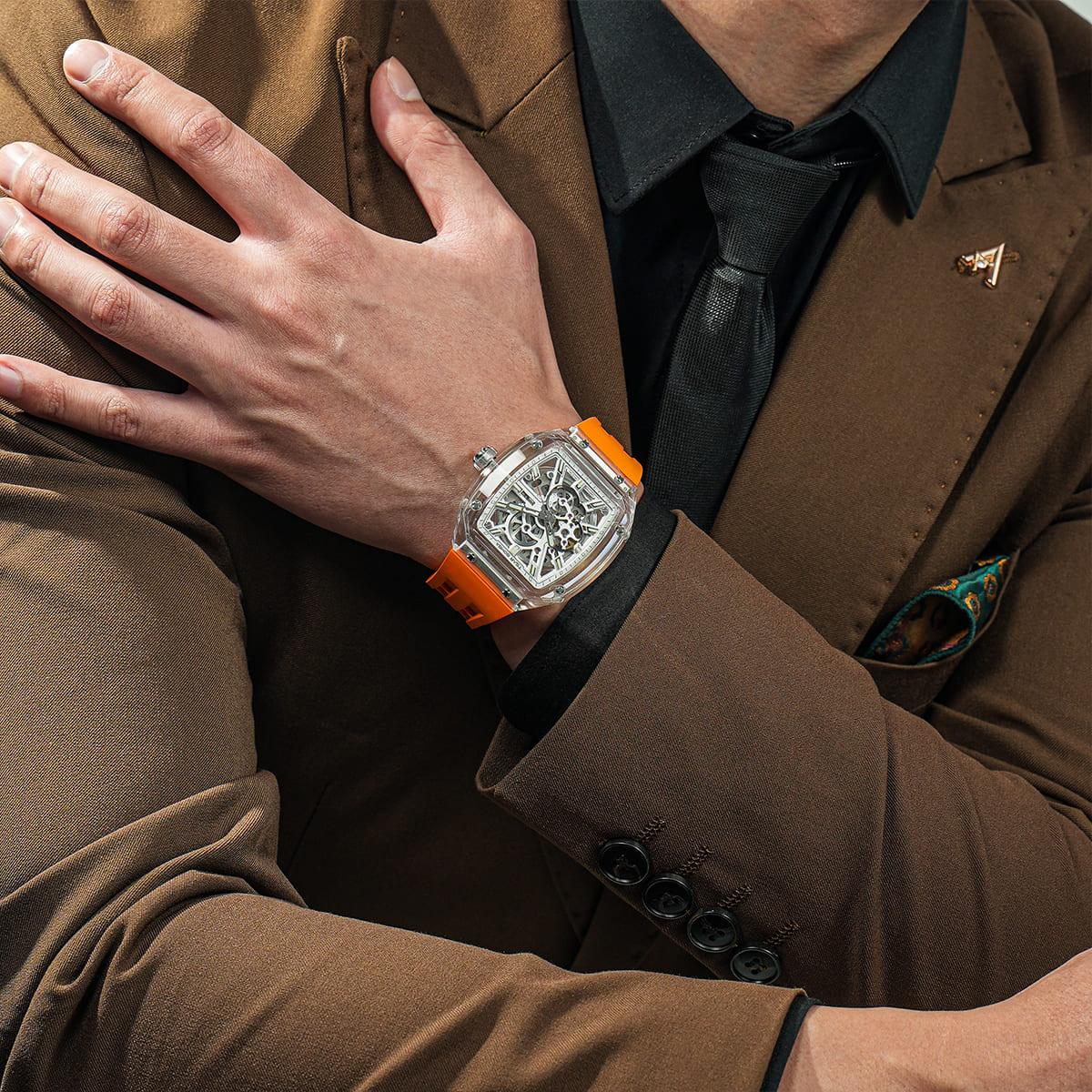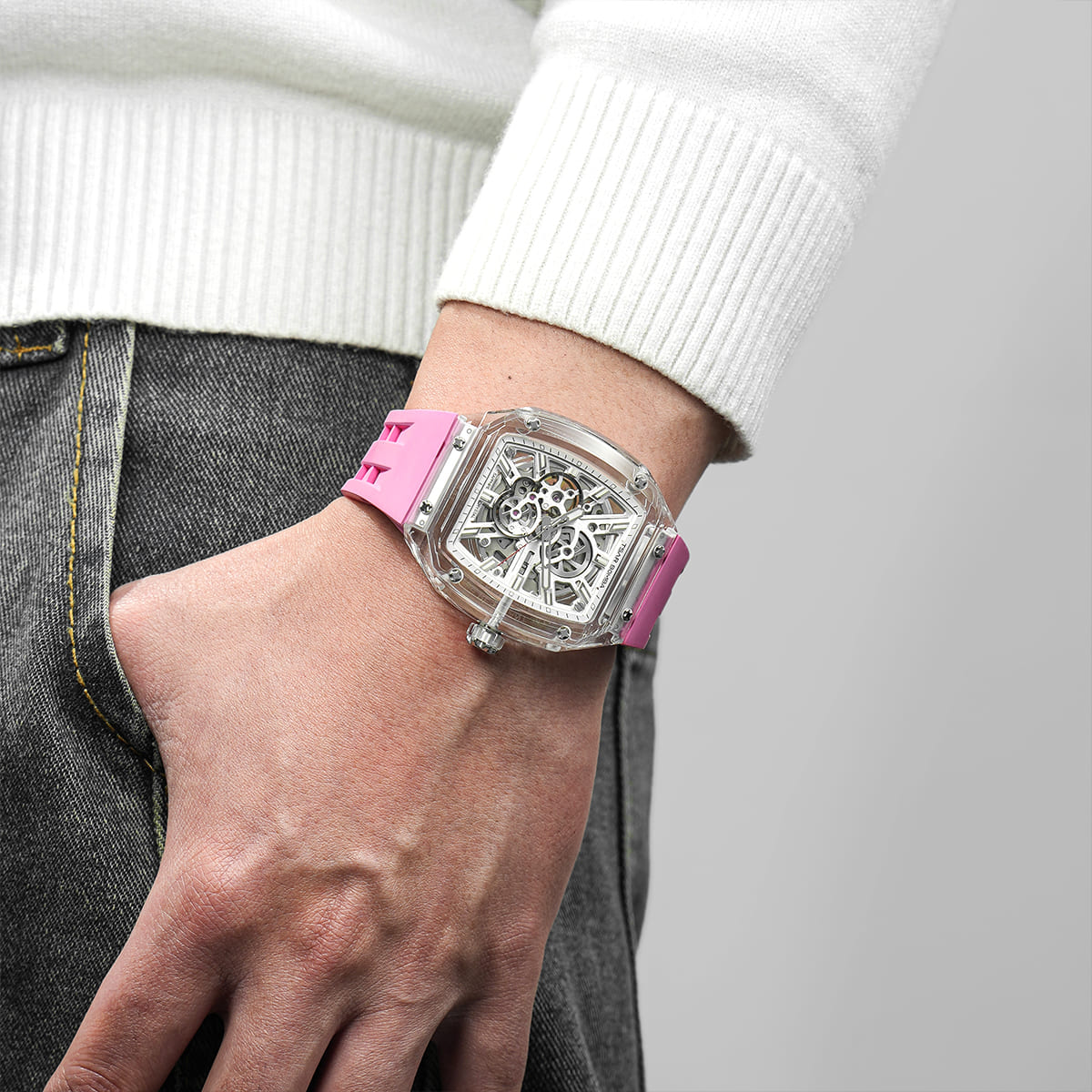 大膽融合現代美學與機械工藝的設計——透明外觀呈現每一個運動細節,讓時間本身成為視覺體驗。